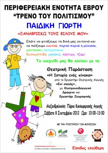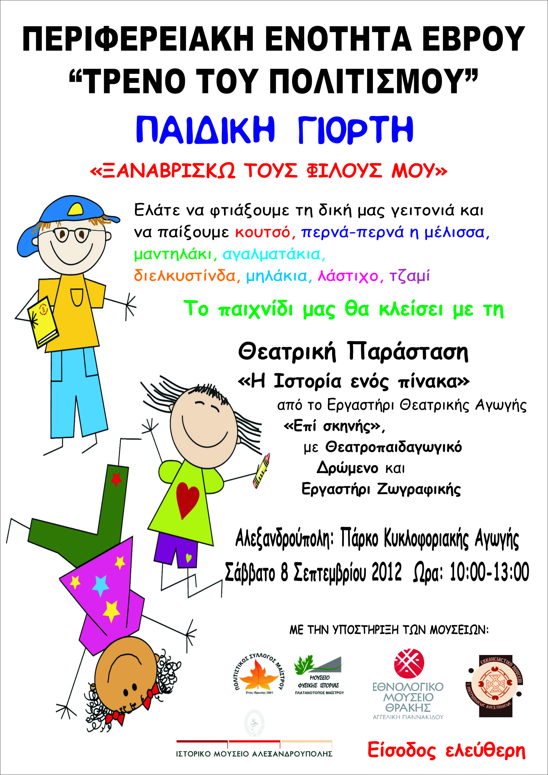 Η Περιφερειακή Ενότητα Έβρου στο πλαίσιο του προγράμματος «Τρένο του Πολιτισμού» διοργανώνει στην Αλεξανδρούπολη εκπαιδευτική και ψυχαγωγική δράση για παιδιά με θέμα «ΞΑΝΑΒΡΙΣΚΩ ΤΟΥΣ ΦΙΛΟΥΣ ΜΟΥ». Η δράση θα πραγματοποιηθεί σε συνεργασία με την υποστήριξη του  Εθνολογικού Μουσείου Θράκης, του Εκκλησιαστικού Μουσείου Αλεξανδρούπολης, του Ιστορικού Μουσείου Αλεξανδρούπολης και του Μουσείου Φυσικής Ιστορίας.