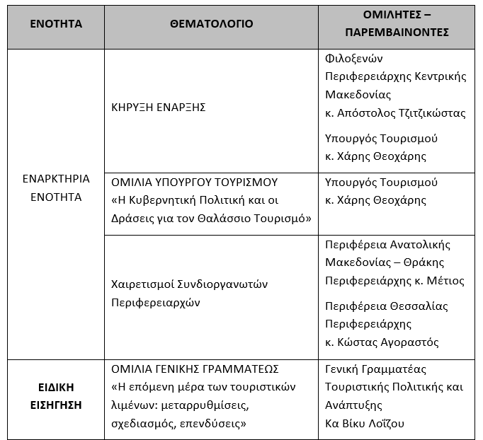 Ο Υπουργός Τουρισμού κ. Θεοχάρης, θα αναφερθεί γενικότερα στην κυβερνητική πολιτική για τον θαλάσσιο τουρισμό, οι συνδιοργανώνουσες Περιφέρειες στα συγκεκριμένα χαρακτηριστικά, πρακτικές και ενέργειες που υλοποιούν, ενώ θα παρουσιαστεί και ειδική πρόταση «Δια-Περιφερειακής Δράσης για τον Θαλάσσιο Τουρισμό» των τριών παραπάνω Περιφερειών.