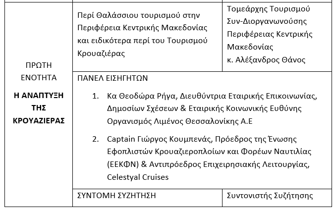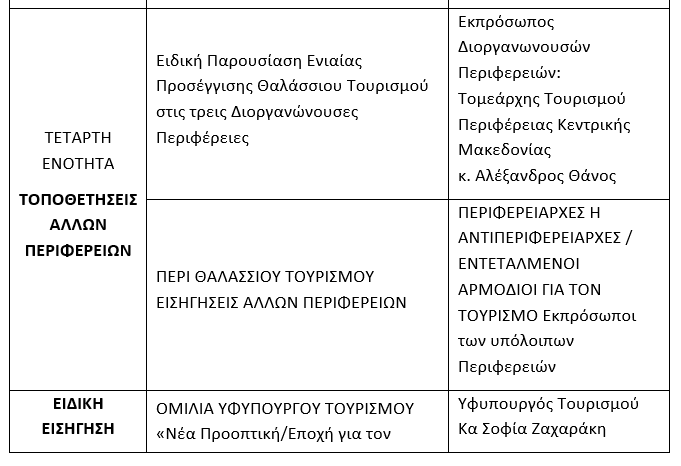Στην Δια-Περιφερειακή Ημερίδα εισήγηση θα κάνει η Υφυπουργός Τουρισμού κα Σοφία Ζαχαράκη, με θέμα «Νέα Προοπτική/Εποχή για τον Παράκτιο και Θαλάσσιο Τουρισμό: Πολιτική Στρατηγικής Ενίσχυσης Ειδικών Μορφών Τουρισμού» και η Γενική Γραμματέας Τουριστικής Πολιτικής και Ανάπτυξης κα Βίκυ Λοΐζου, με θέμα «Η επόμενη μέρα των τουριστικών λιμένων: μεταρρυθμίσεις, σχεδιασμός, επενδύσεις».