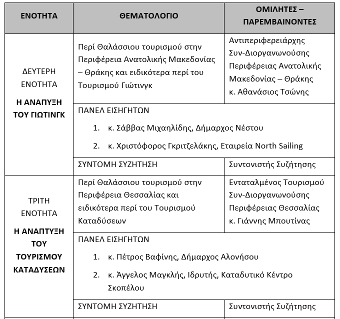 Στο πλαίσιο της λειτουργίας του Περιφερειακού Συμβουλίου Τουρισμού, ο Υπουργός Τουρισμού κ. Χάρης Θεοχάρης ανακοίνωσε την έναρξη τωης πρωτοβουλίας διοργάνωσης Δια-περιφερειακών Ημερίδων. Την ερχόμενη Τρίτη 20 Απριλίου 2021, συνδιοργανώνουν το Υπουργείο Τουρισμού και οι Περιφέρειες Κεντρικής Μακεδονίας, Ανατολικής Μακεδονίας – Θράκης και Θεσσαλίας, τη 1η Δια-Περιφερειακή Ημερίδα με θέμα «Θαλάσσιος Τουρισμός – Κρουαζιέρα – Γιώτινγκ – Κατάδυση».