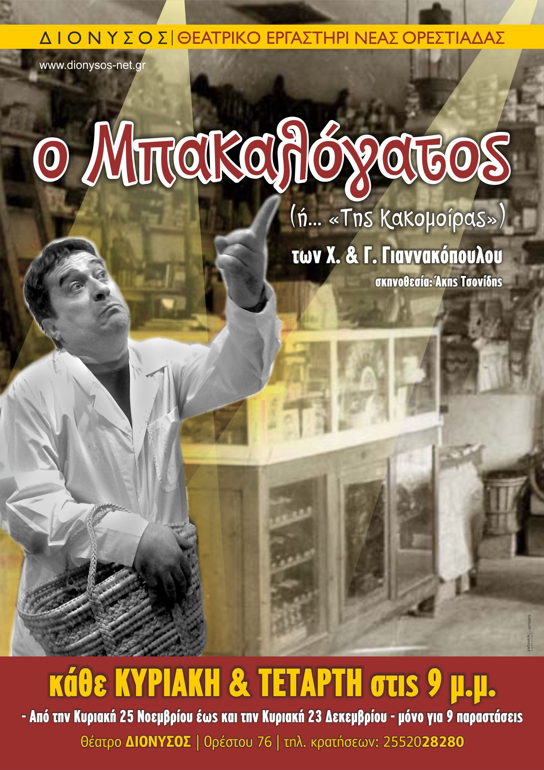 “Ο Μπακαλόγατος” (ή “Της Κακομοίρας”), η γνωστή και αγαπημένη κωμωδία των Χρήστου & Γιάννη Γιαννακόπουλου, ανεβαίνει αυτήν την Κυριακή 25/11 και θα παίζεται ΚΑΘΕ Κυριακή & Τετάρτη στις 9 το βράδυ στο Θέατρο “ΔΙΟΝΥΣΟΣ” (Ορέστου 76, τ. 2552028280, Νέα Ορεστιάδα), έως και την Κυριακή 23 Δεκεμβρίου, συνολικά μόνο για 9 παραστάσεις.