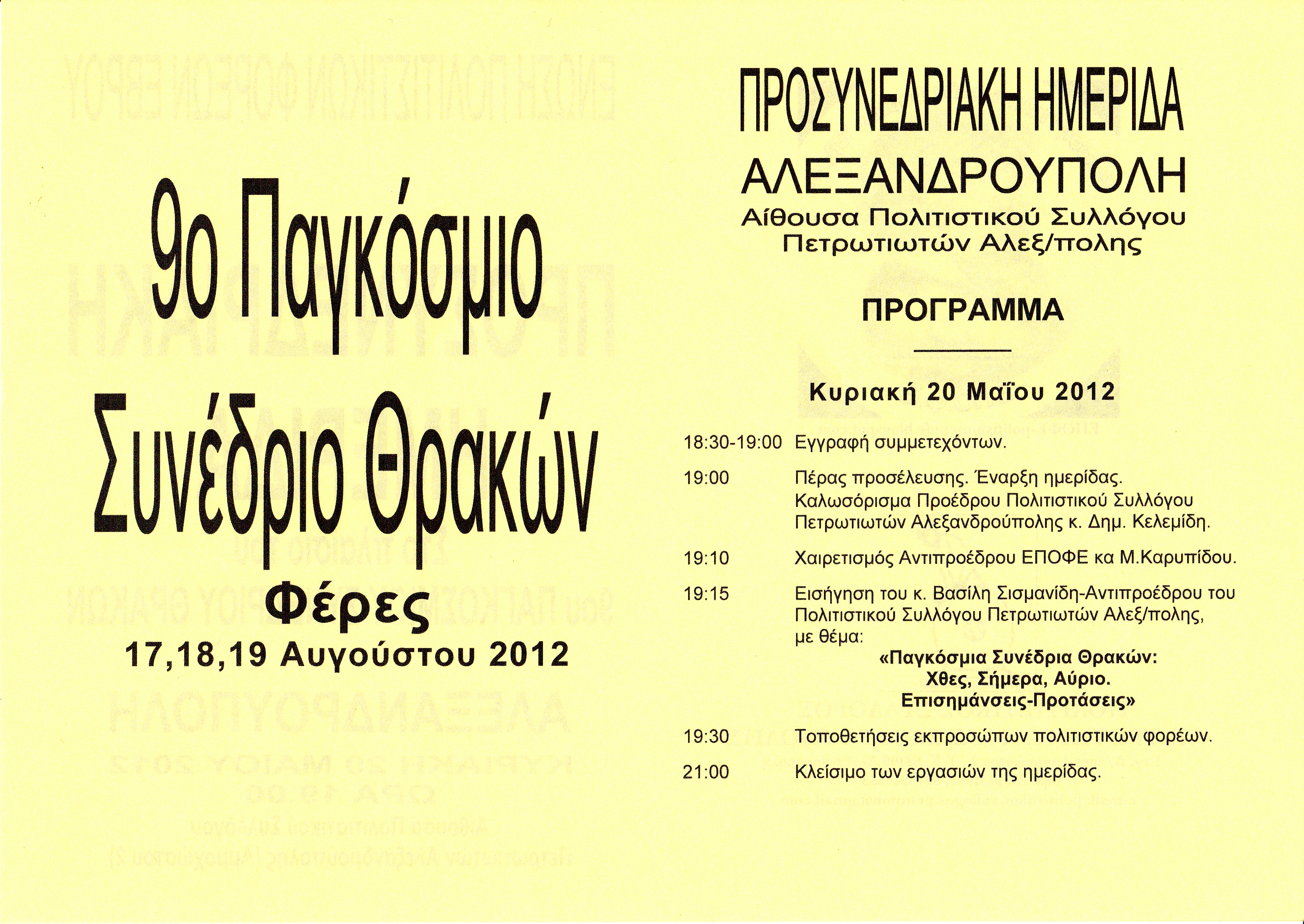 Η Ένωση Πολιτιστικών Φορέων Έβρου και ο Πολιτιστικός Σύλλογος Πετρωτιωτών Αλεξανδρούπολης διοργανώνουν την Κυριακή 20 Μαΐου 2012 και ώρα 19.00 στην Αίθουσα του Πολιτιστικού Συλλόγου Πετρωτιωτών Αλεξανδρούπολης (Αμμοχώστου 2) Προσυνεδριακή Ημερίδα στο πλαίσιο του 9ου Παγκόσμιου Συνεδρίου Θρακών, που θα πραγματοποιηθεί στις Φέρες στις 17-19 Αυγούστου.
