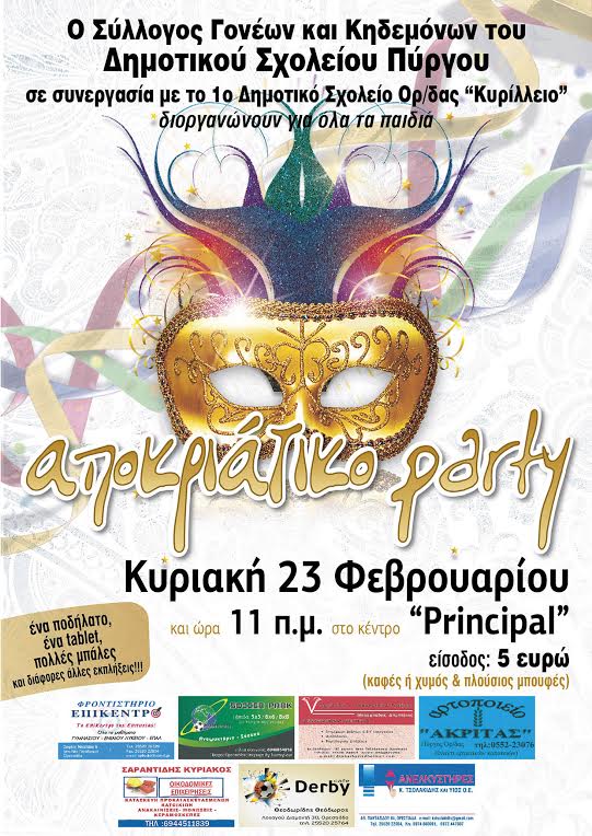 Πρόσκληση στο αποκριάτικο party του Δημοτικού Σχολείου Πύργου