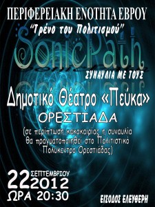 Η Περιφερειακή Ενότητα Έβρου, στο πλαίσιο του προγράμματος «Τρένο του Πολιτισμού», διοργανώνει συναυλία με το συγκρότημα «SONIC PATH» του Βαγγέλη Γεωργίου το ΣΑΒΒΑΤΟ 22 ΣΕΠΤΕΜΒΡΙΟΥ 2012 και ώρα 20:30 στο Υπαίθριο Δημοτικό Θέατρο Ορεστιάδας «Πεύκα» (σε περίπτωση κακοκαιρίας η συναυλία θα πραγματοποιηθεί στο Πολιτιστικό Πολύκεντρο Ορεστιάδας).