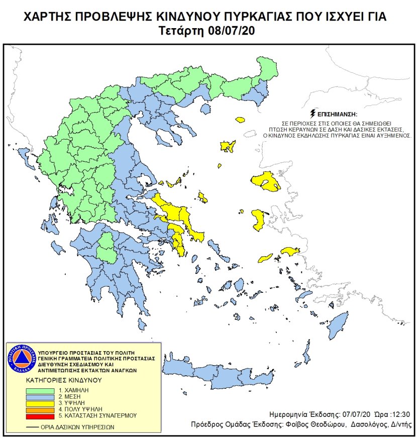 Σύμφωνα με το Χάρτη Πρόβλεψης Κινδύνου Πυρκαγιάς που εκδίδει η Γενική Γραμματεία Πολιτικής Προστασίας του Υπουργείου Εσωτερικών και Διοικητικής Ανασυγκρότησης, για σήμερα Τετάρτη, 8 Ιουλίου, προβλέπεται υψηλός κίνδυνος πυρκαγιάς (κατηγορία κινδύνου 3), σε ορισμένες περιοχές της Ελλάδας.