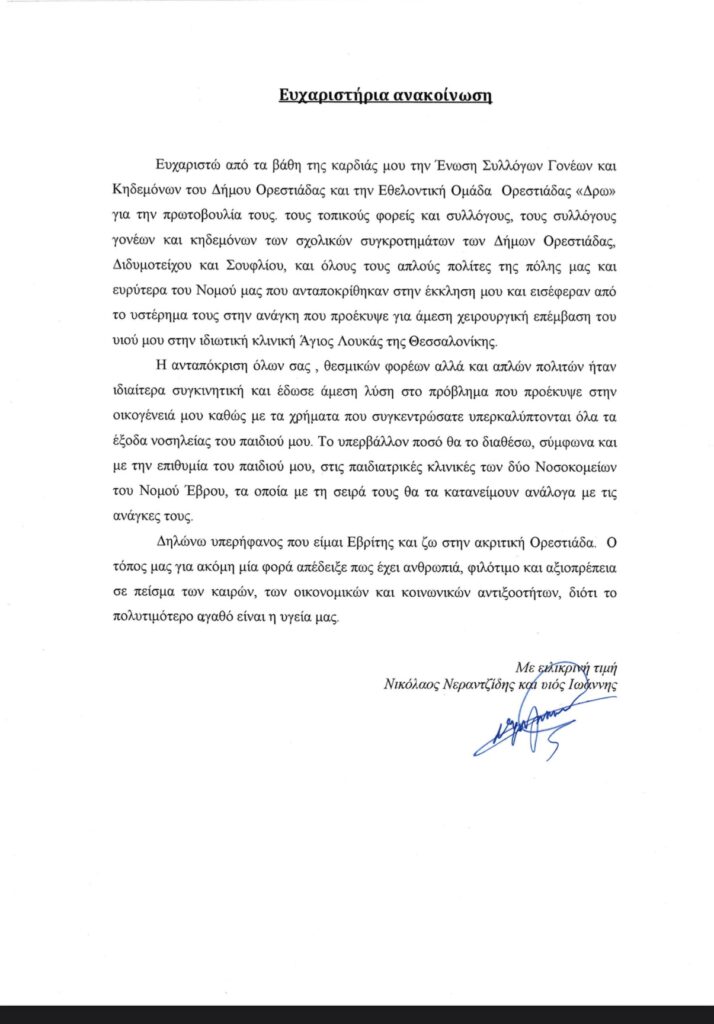 Ο πατέρας Νίκος Νεραντζίδης μαζί με τον 16χρονο Γιάννη εκφράζουν τις ευχαριστίες τους σε όσους συνέβαλαν στη συγκέντρωση των χρημάτων. Μάλιστα τα χρήματα υπερκαλύπτουν και τη νοσηλεία του παιδιού, γι’ αυτό με επιθυμία του ίδιου τα επιπλέον χρήματα θα δωριστούν στα δύο νοσοκομεία του Έβρου.
