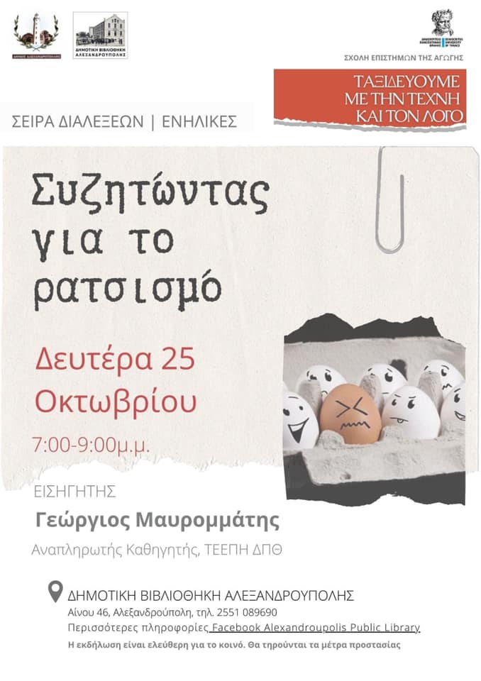 Στο πλαίσιο του εκπαιδευτικού προγράμματος “Ταξιδεύουμε με την Τέχνη και τον Λόγο”, που υλοποιείται στη Δημοτική Βιβλιοθήκη Αλεξανδρούπολης, σε συνεργασία του Δήμου Αλεξανδρούπολης με τη Σχολή Επιστημών της Αγωγής του Δ.Π.Θ., σας προσκαλούμε στην πρώτη διάλεξη για ενήλικες, την Δευτέρα 25 Οκτωβρίου 2021, στις 7.00 μ.μ., με τον τίτλο: “Συζητώντας για τον ρατσισμό”.