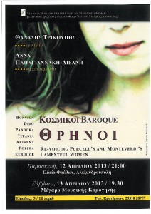 Ο Σύλλογος Μουσικών Εκπαιδευτικών Ανατολικής Μακεδονίας και Θράκης σας προσκαλεί στη συναυλία των Άννα Παπαγιαννάκη-Διβανή (mezzosoprano) και   Θανάση Τρικούπη (τσέμπαλο) με τίτλο «Θρήνοι του BaroqueRevoicing Purcellsand Monteverdis Lamentful Women» που θα λάβει χώρα την Παρασκευή, 12 Απριλίου 2013 και ώρα 21:00 στην Αίθουσα Συναυλιών του Ωδείου ‘Φαέθων’ (14ης Μαΐου 121) στην Αλεξανδρούπολη και το Σάββατο, 13 Απριλίου 2013 και ώρα 19:30 στο Μέγαρο Μουσικής Κομοτηνής στην Κομοτηνή.