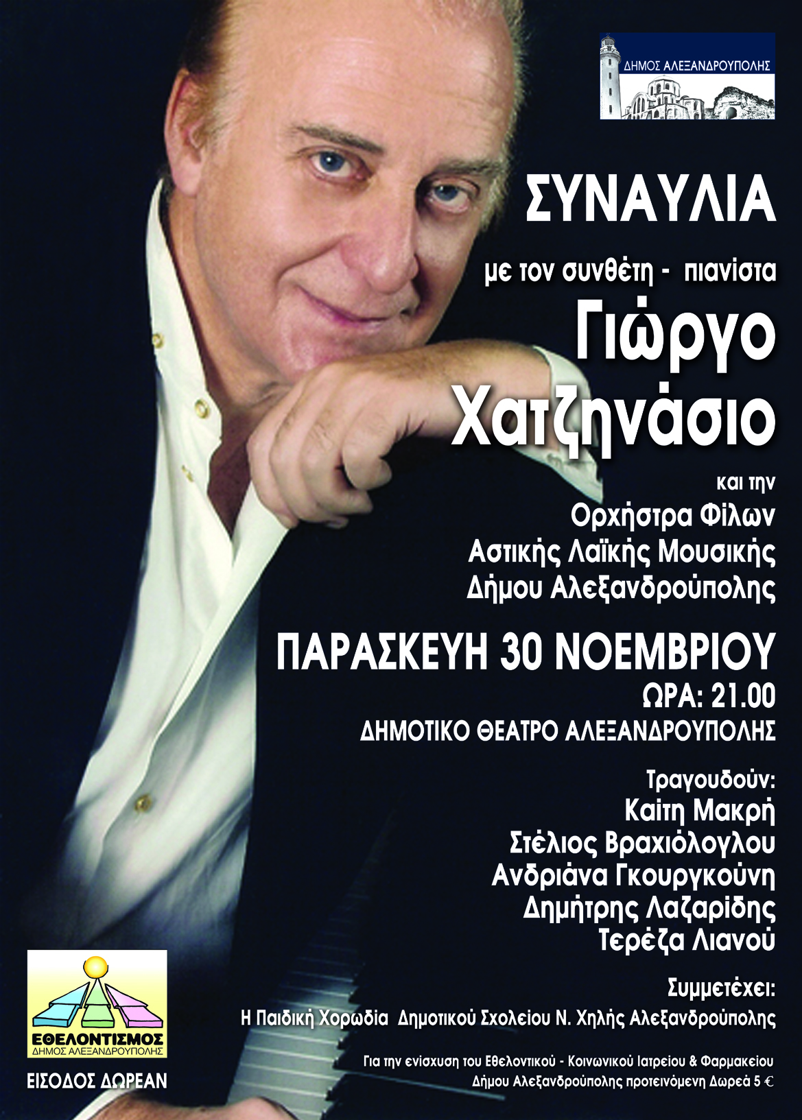 Μεγάλη Συναυλία με τον συνθέτη-πιανίστα Γιώργο Χατζηνάσιο θα πραγματοποιηθεί την Παρασκευή 30 Νοεμβρίου 2012 και ώρα 21:00, στο Δημοτικό Θέατρο Αλεξανδρούπολης.
