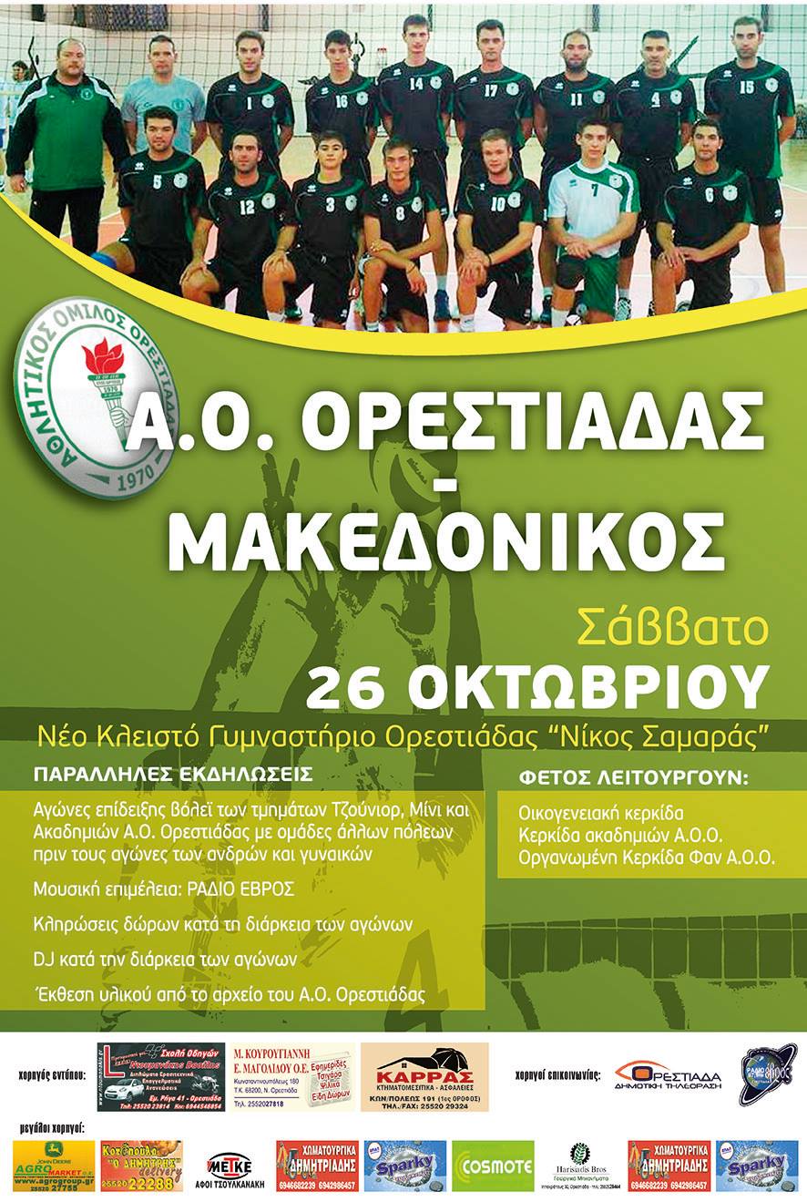 Τον Α.Σ. Μακεδονικό υποδέχεται σήμερα ο Αθλητικός Όμιλος Ορεστιάδας στις 19:00 στα πλαίσια της 2ης Αγωνιστικής της Α2 Εθνικής κατηγορίας Βόλεϊ Ανδρών.Ο αγώνας θα διεξαχθεί στο Νέο Κλειστό Γυμναστήριο Νίκος Σαμαράς στις 19:00 το απόγευμα.