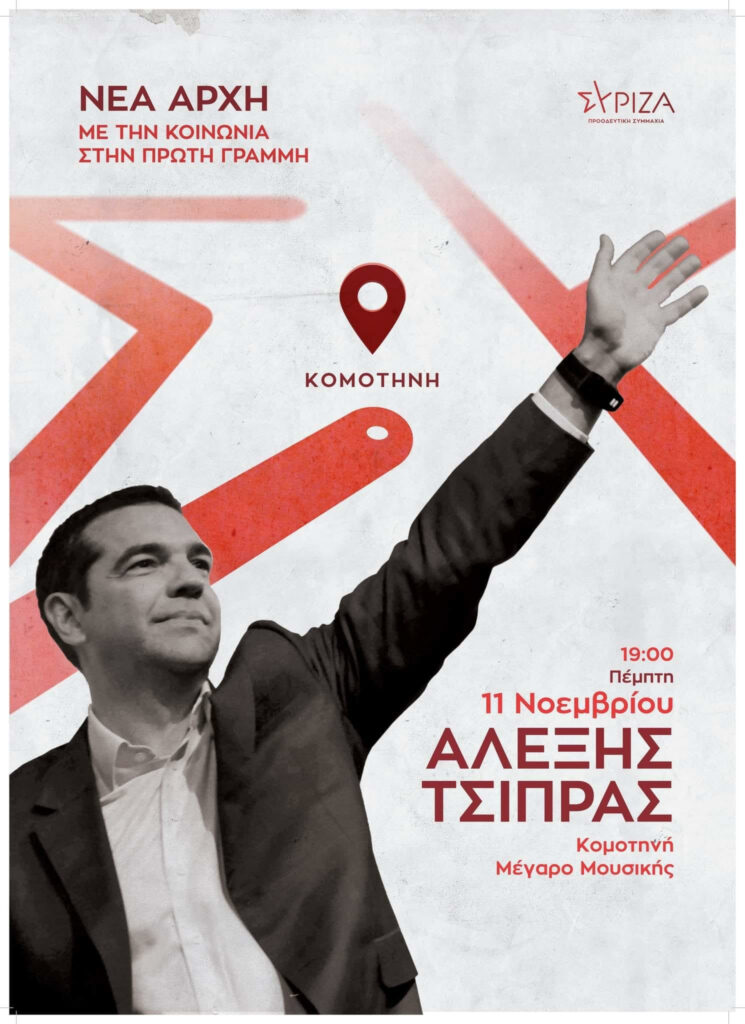 Ο πρόεδρος του ΣΥΡΙΖΑ – Προοδευτική Συμμαχία, Αλέξης Τσίπρας, θα πραγματοποιήσει περιοδεία στη Θράκη, την Πέμπτη 11 Νοεμβρίου.