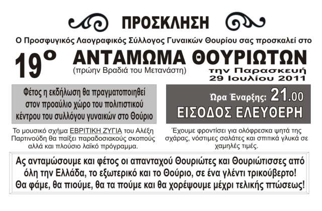 Ας ανταμώσουμε και φέτος οι απανταχού Θουριώτες και Θουριώτισσες από όλη την Ελλάδα, το εξωτερικό και το Θούριο, σε ένα γλέντι τρικούβερτο!