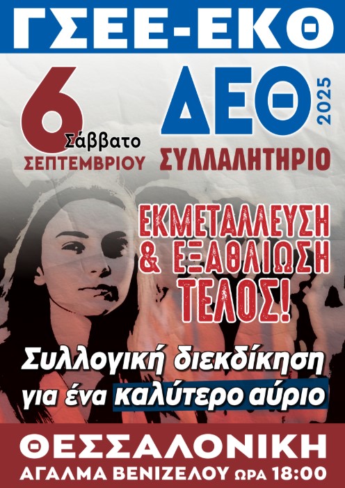 Καλούμε τα σωματεία και όλους τους εργαζόμενους, τους συνταξιούχους και τους ανέργους στo μεγάλο εργατικό και κοινωνικό συλλαλητήριο το ΣΑΒΒΑΤΟ 6 Σεπτέμβρη 2025 στις 18:00, στο Άγαλμα του Βενιζέλου στην Πλατεία Αριστοτέλους, στη ΘΕΣΣΑΛΟΝΙΚΗ και στην πορεία διαμαρτυρίας που θα