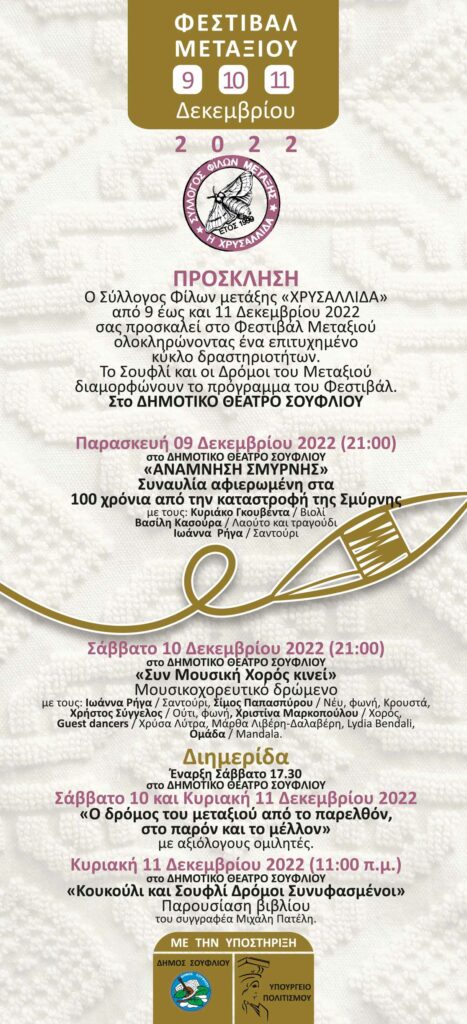 Ο Σύλλογος Φίλων μετάξης «ΧΡΥΣΑΛΛΙΔΑ» από 9 έως και 11 Δεκεμβρίου 2022 σας προσκαλεί στο Φεστιβάλ Μεταξιού ολοκληρώνοντας ένα επιτυχημένο  κύκλο δραστηριοτήτων. Το Σουφλί και οι Δρόμοι του Μεταξιού διαμορφώνουν το πρόγραμμα του Φεστιβάλ.