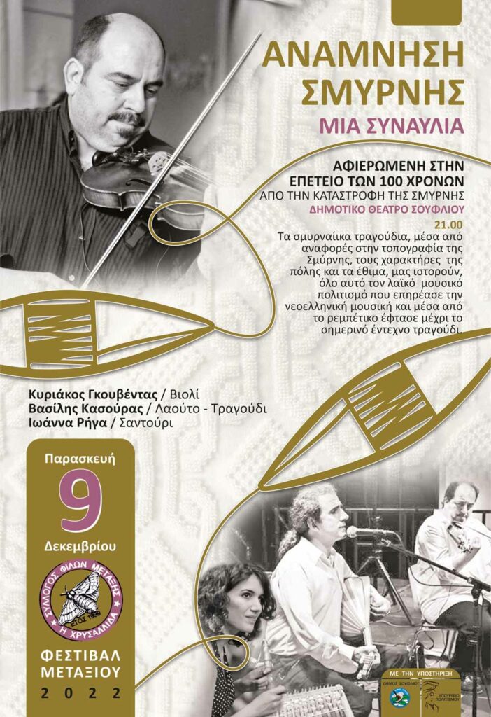 «ΑΝΑΜΝΗΣΗ ΣΜΥΡΝΗΣ»  Συναυλία αφιερωμένη στα  100 χρόνια από την καταστροφή της Σμύρνης με τους: Κυριάκο Γκουβέντα / Bιολί Βασίλη Κασούρα / Λαούτο και τραγούδι Ιωάννα  Ρήγα / Σαντούρι