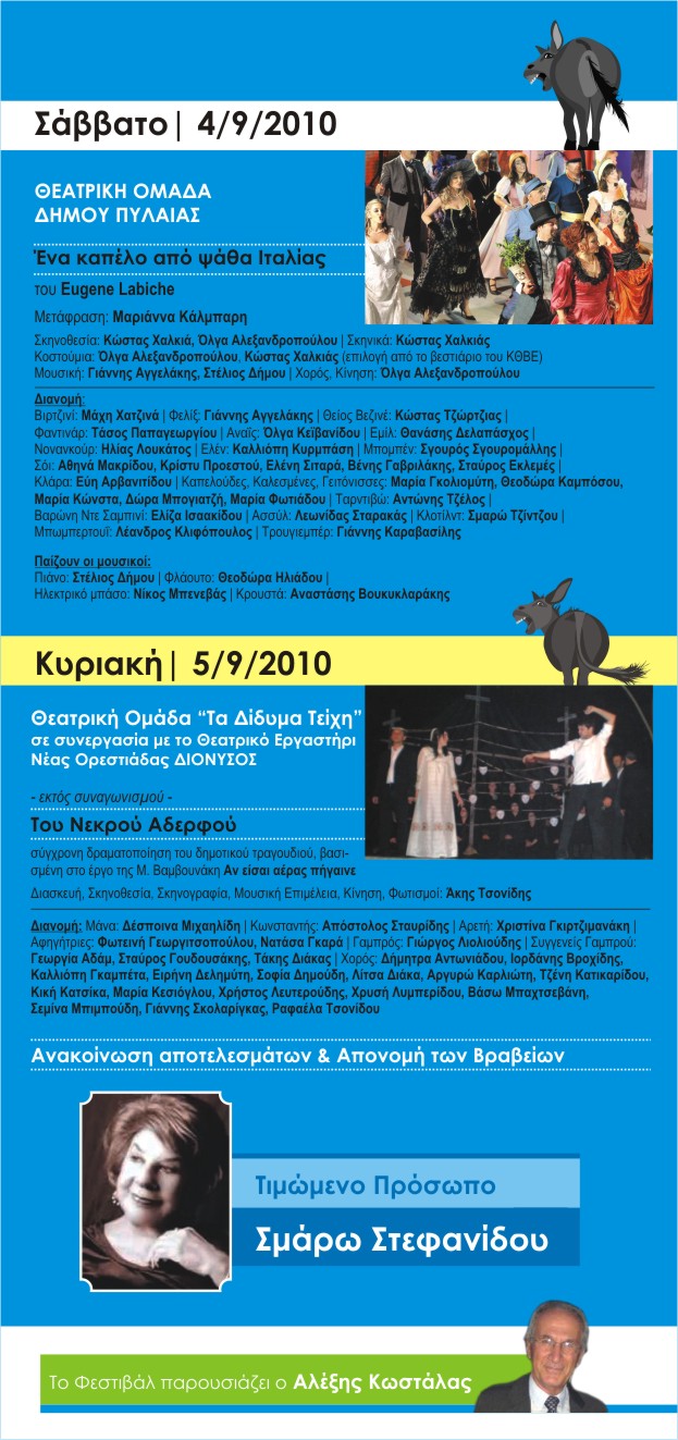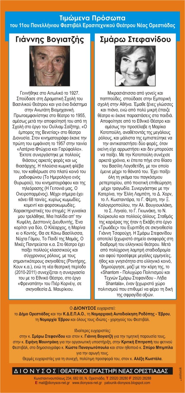 Το Φεστιβάλ φέτος είναι αφιερωμένο σε δύο εξαιρετικές προσωπικότητες του Θεάτρου και του Κινηματογράφου, τους σημαντικούς ηθοποιούς Γιάννη Βογιατζή και Σμάρω Στεφανίδου.