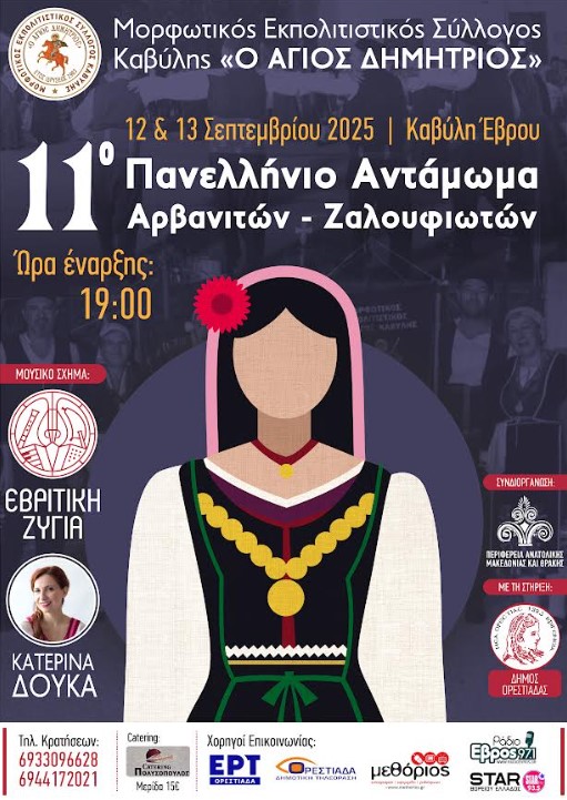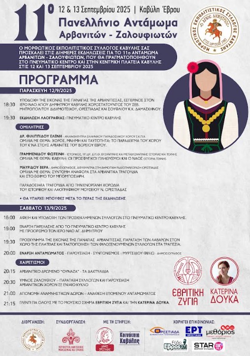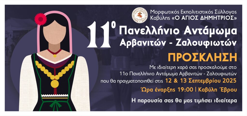 Η Καβύλη ετοιμάζεται να υποδεχτεί το 11ο Πανελλήνιο Αντάμωμα Αρβανιτών-Ζαλουφιωτών, μια διήμερη γιορτή πολιτιστικής μνήμης και λαογραφικής παράδοσης, που θα πραγματοποιηθεί την Παρασκευή 12 και το Σάββατο 13 Σεπτεμβρίου 2025.