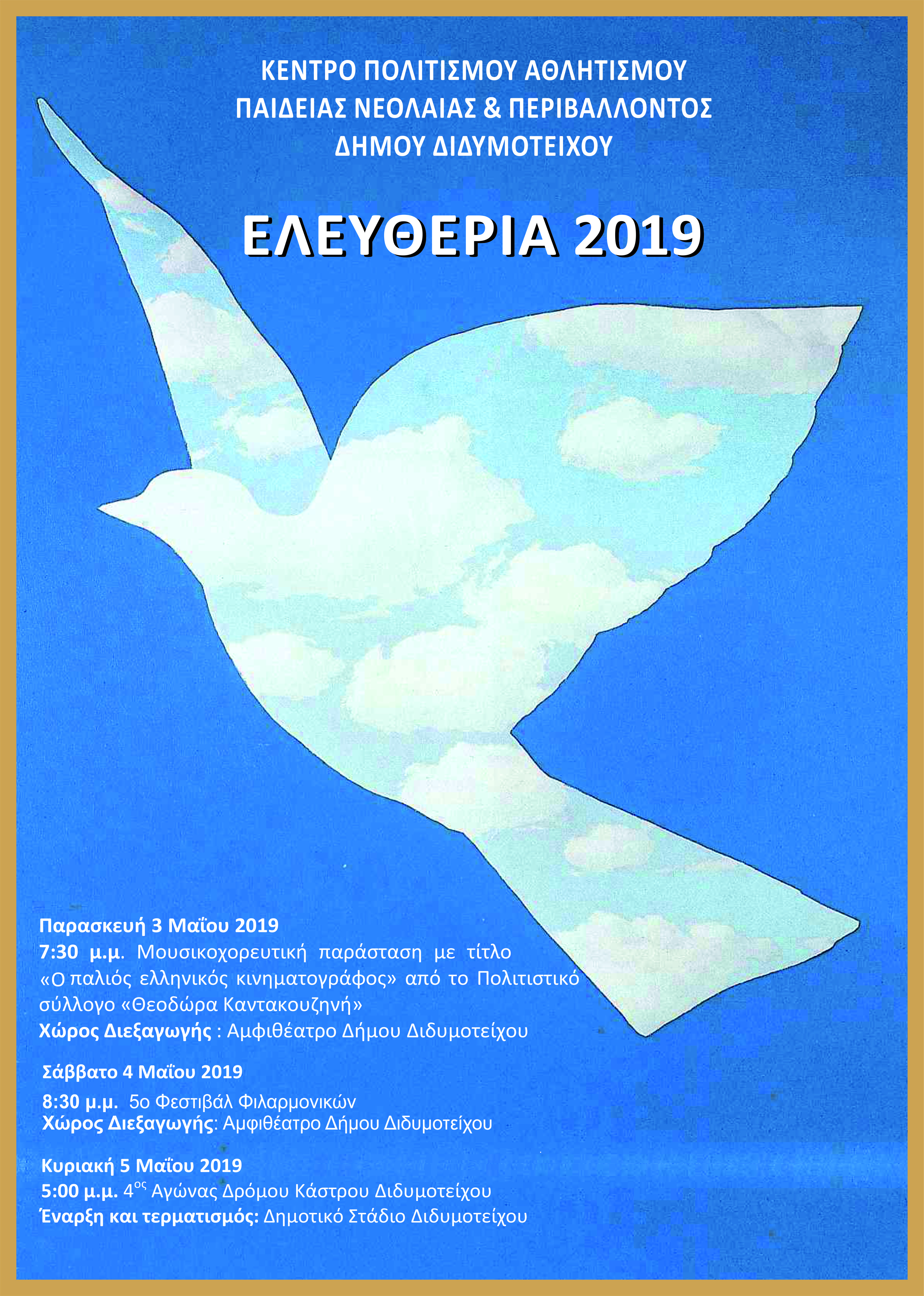 Το φετινό πρόγραμμα των ΕΛΕΥΘΕΡΙΩΝ 2019 έχει ως εξής: