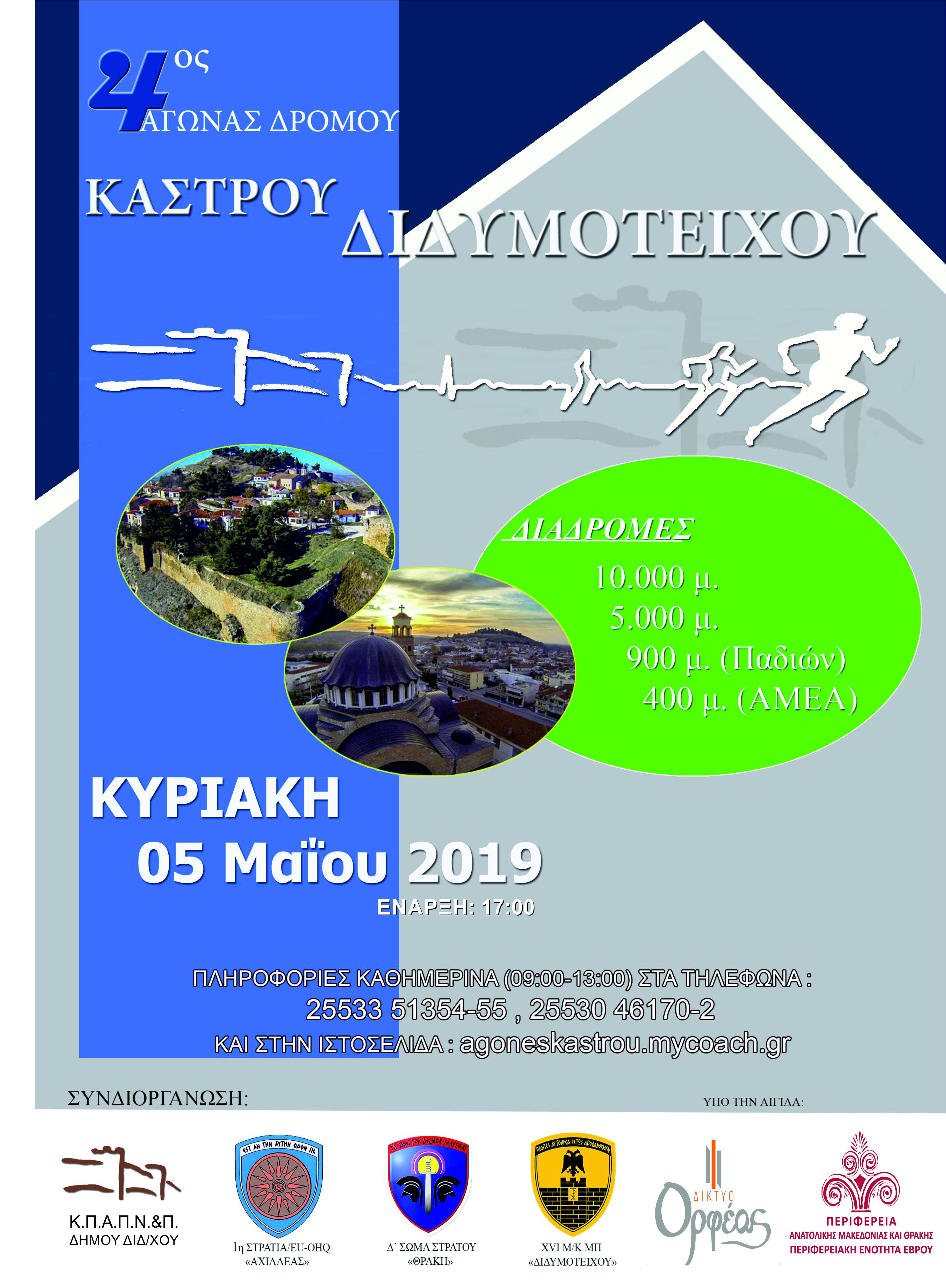 Την Κυριακή 5 Μαΐου 2019 στις 5:00 μ.μ. θα πραγματοποιηθεί ο 4ος Αγώνας Δρόμου Κάστρου Διδυμοτείχου που γίνεται με τη συνδιοργάνωση του Κέντρου Πολιτισμού-Αθλητισμού-Παιδείας-Νεολαίας και Περιβάλλοντος του Δήμου, την 1η ΣΤΡΑΤΙΑ/EU-OHQ “ΑΧΙΛΛΕΑΣ”, του Δ’ Σώματος Στρατού και της XVI Μ/Κ ΜΠ “ΔΙΔΥΜΟΤΕΙΧΟΥ και υπό την αιγίδα της Περιφέρειας Ανατολικής Μακεδονίας & Θράκης-Περιφερειακή Ενότητα Έβρου.