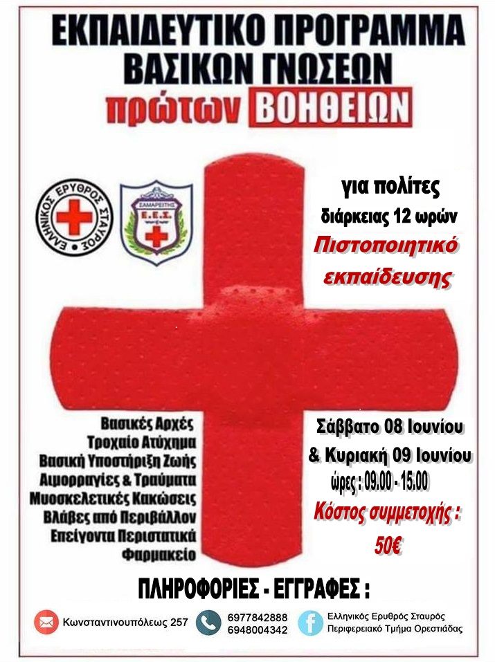 Απευθύνεται σε όλους του πολίτες και η θεματολογία μεταξύ άλλων θα είναι, βασική υποστήριξη ζωής, τροχαίο ατύχημα, επείγοντα περιστατικά, αιμορραγίες, τραύματα, ενώ θα αποδοθούν και πιστοποιητικά εκπαίδευσης.