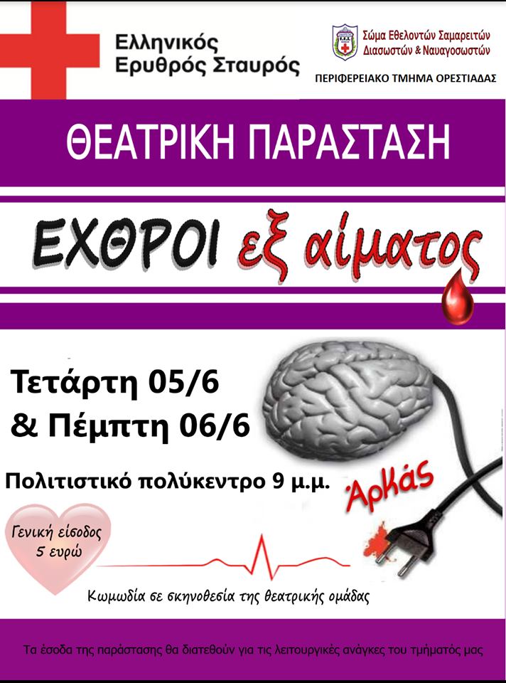 Η Θεατρική παράσταση “Εχθροί εξ αίματος” του Αρκά μια παραγωγή του Τμήματος Σαμαρειτών του ΕΕΣ Διδυμοτείχου στις 05-06 και 06-06-2019 στο Πολιτιστικό Πολύκεντρο Ορεστιάδας στις 21:00