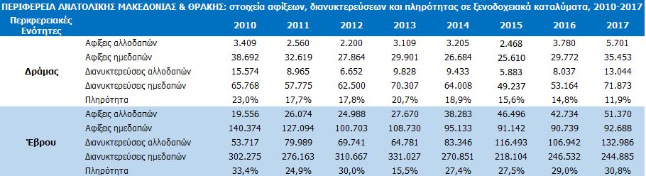 Σε αυτή φαίνεται μια σταδιακή ενίσχυση της τουριστικής κίνησης, ιδιαίτερα τα τελευταία χρόνια με μια μικρή «κοιλιά» το 2017, ενώ θετικά είναι και τα μηνύματα για τη Ροδόπη, που το 2018 είχε πληρότητα άνω του μέσου όρου της Περιφέρειας στα καταλύματα της.