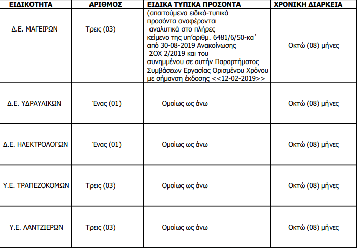 Ανακοίνωνει ότι θα προσλάβει προσωπικό με σύμβαση εργασίας ιδιωτικού δικαίου ορισμένου χρόνου, συνολικού αριθμού έντεκα (11) ατόμων για την κάλυψη παροδικών αναγκών, σύμφωνα με τις διατάξεις του άρθρου 21 του Ν. 2190/94 «Σύσταση ανεξάρτητης αρχής για την επιλογή προσωπικού και ρύθμιση θεμάτων διοίκησης» (ΦΕΚ 28 Α΄) όπως έχουν τροποποιηθεί και ισχύουν, σε συνδυασμό με τις διατάξεις της παρ. 9 του άρθρου 25 του Ν. 4440/2016 (ΦΕΚ 224 Α΄) και του άρθρου 9 του Ν.4057/2012 «Πειθαρχικό Δίκαιο Δημοσίων Πολιτικών Διοικητικών Υπαλλήλων και Υπαλλήλων Νομικών Προσώπων Δημοσίου Δικαίου» (ΦΕΚ 54 Α΄) για τις εξής, κατά αριθμό ατόμων ειδικότητες, με τα αντίστοιχα ειδικά και τυπικά προσόντα και την αντίστοιχη χρονική περίοδο ως ακολούθως: