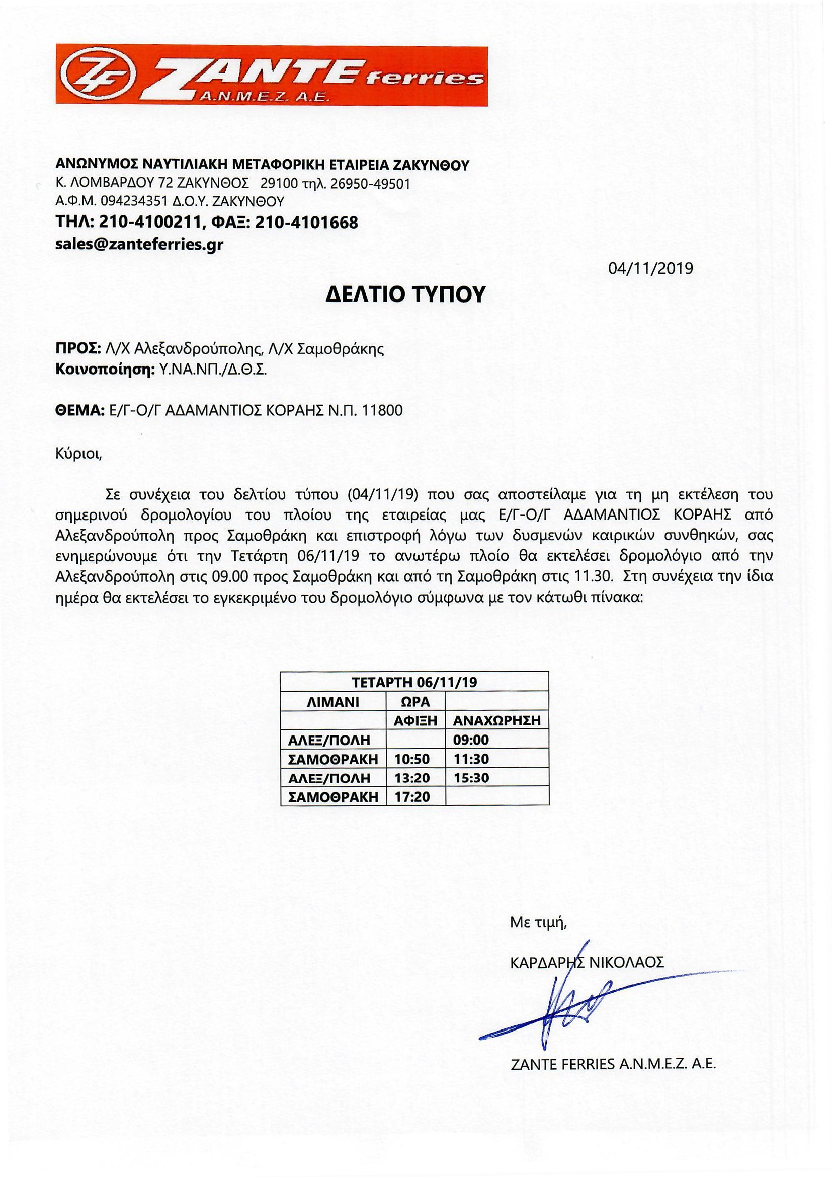 Η ΖΑΝΤΕ ferries σε συνέχεια της γνωστοποίησης της για την αδυναμία εκτέλεσης των σημερινών δρομολογίων του Ε/Γ-Ο/Γ ΑΔΑΜΑΝΤΙΟΣ Κοραής εξέδωσε νεότερη ανακοίνωση με την οποία κάνει γνωστή στο κοινό την διαμόρφωση των δρομολογίων της Τετάρτης: