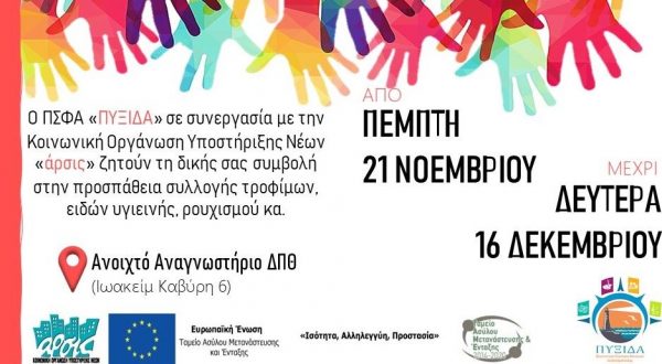 Ο Πολιτιστικός Σύλλογος Φοιτητών Αλεξανδρούπολης «ΠΥΞΙΔΑ» σε συνεργασία με την Κοινωνική Οργάνωση Υποστήριξης Νέων «άρσις» ζητούν τη δικής σας συμβολή στην προσπάθεια συλλογής τροφίμων, ειδών υγιεινής, ρουχισμού κα.