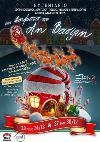 Τι είναι; Μια νέα προσπάθεια του Δήμου Διδυμοτείχου και του κέντρου Πολιτισμού, Αθλητισμού, Παιδείας, Νεολαίας και Περιβάλλοντος “Ευγενίδειο” σε συνεργασία με τους συλλόγους, ομάδες, επαγγελματίες και φορείς της περιοχής, ένας κλειστός χριστουγεννιάτικος πολυχώρος στην καρδιά της πόλης με πολλές εκδηλώσεις υπόσχεται να βάλει όλη την πόλη στο πνεύμα των Χριστουγέννων!