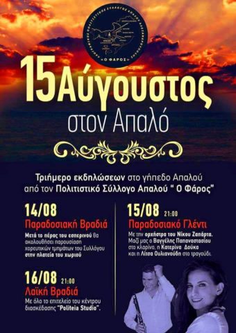 15Αύγουστος στον Απαλό: Τριήμερο εκδηλώσεων στο γήπεδο Απαλού από τον Πολιτιστικό Σύλλογο Απαλού “Ο Φάρος”.