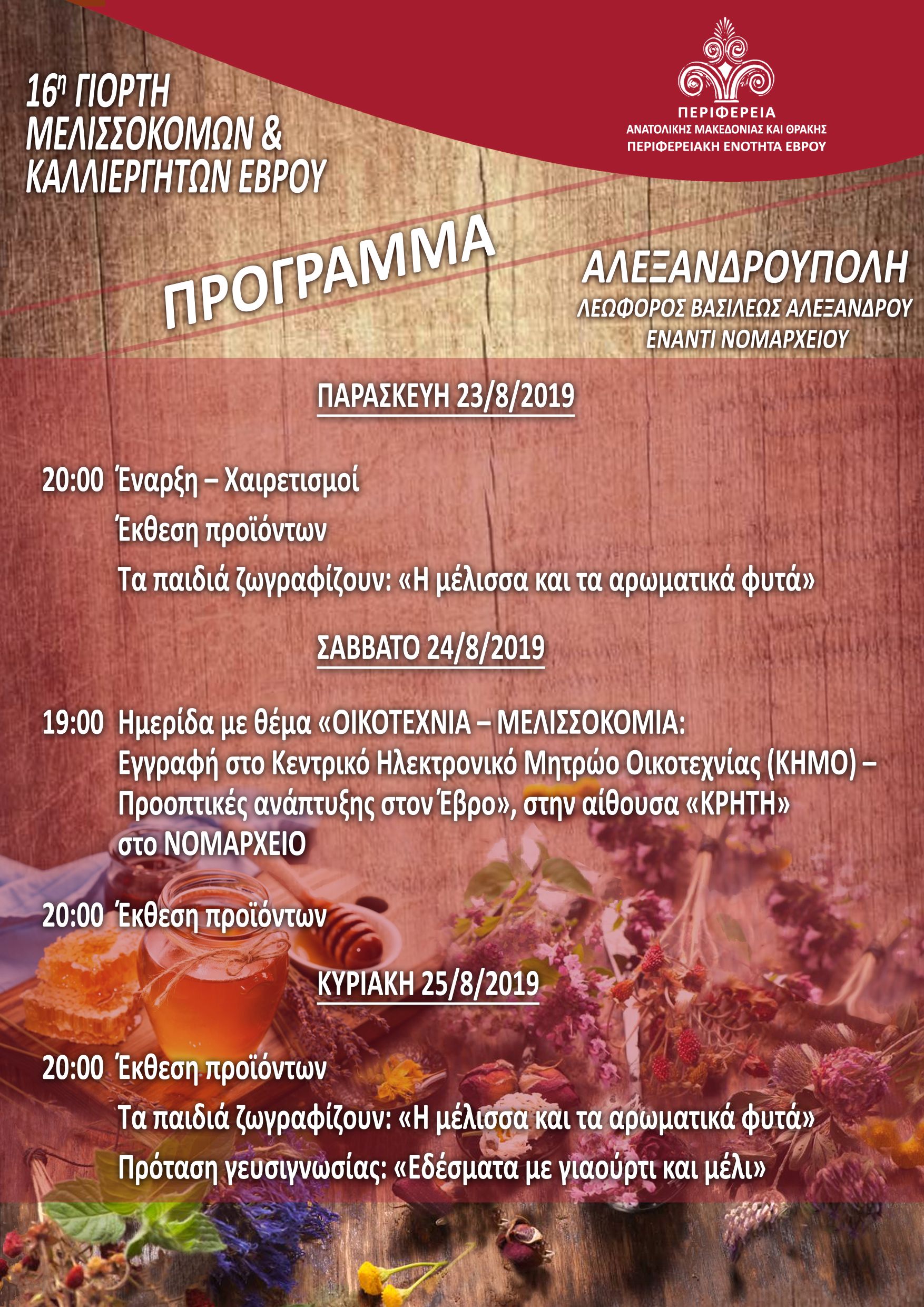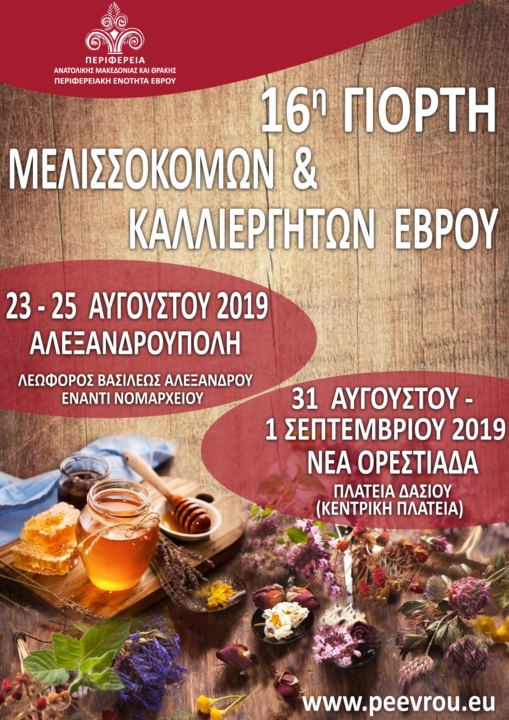 Για 16η χρονιά η Περιφέρεια Ανατολικής Μακεδονίας και Θράκης – Περιφερειακή Ενότητα Έβρου διοργανώνει τη «Γιορτή Μελισσοκόμων & Καλλιεργητών Νομού Έβρου» σε συνεργασία με Συλλόγους μελισσοκόμων και καλλιεργητών της Περιφέρειας, από την Παρασκευή 23 έως και την Κυριακή 25 Αυγούστου.