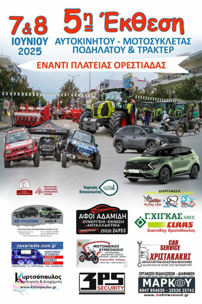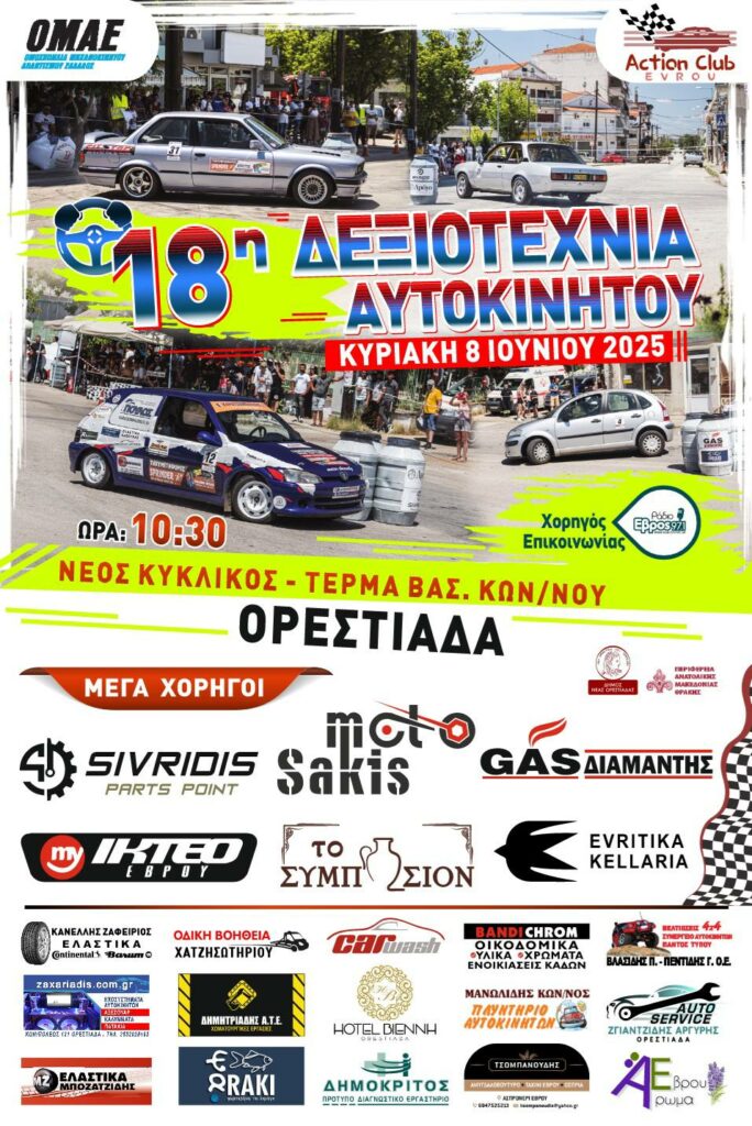 Το αθλητικό σωματείο Action Club Έβρου διοργανώνει την 18η δεξιοτεχνία αυτοκίνητων Ορεστιάδας την Κυριακή 8 Ιουνίου 2025 στις 10:30 π.μ στην οδό Βασιλέως Κωνσταντίνου, Ζαρίφη και επαρχιακής οδού στο νέο κυκλικό κόμβο. Ο αγώνας προσμετρά στο Κύπελλο δεξιοτεχνιών βορείου Ελλάδος και διοργανώνεται υπό την αιγίδα της Ο.Μ.Α.Ε. προσελκύοντας πλήθος αθλητών από όλη τη Βόρεια Ελλάδα.