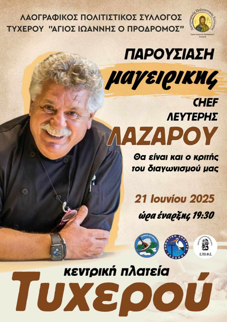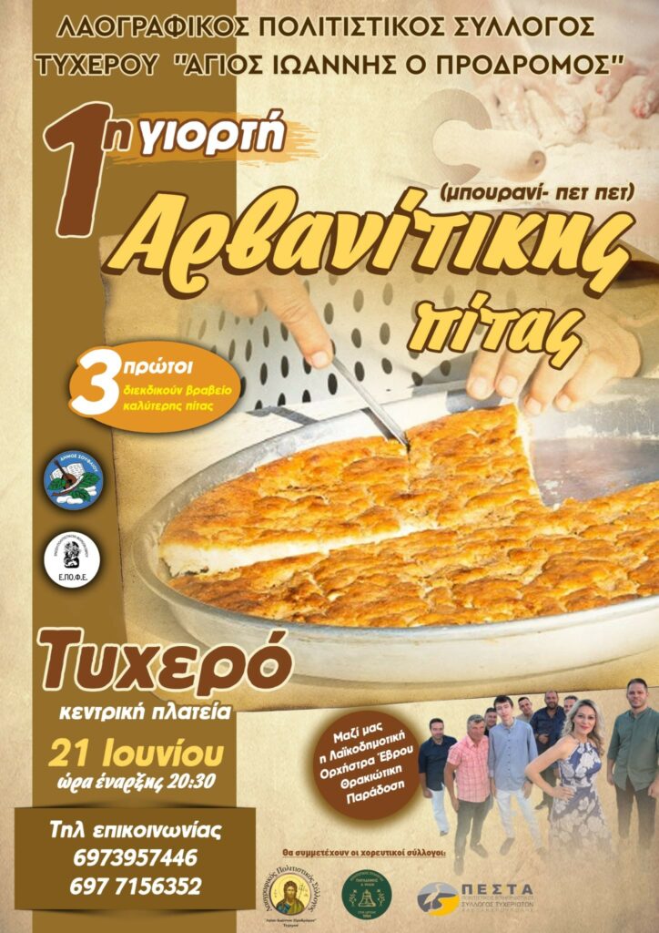 Ο Λαογραφικός Πολιτιστικός Σύλλογος “Αγίου Ιωάννου Προδρόμου” Τυχερού διοργανώνει την πρώτη γιορτή Αρβανίτικης πίτας στο Τυχερό το Σάββατο 21 Ιουνίου 2025