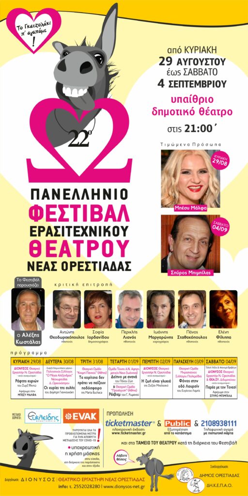 Από τις 29 Αυγούστου έως και τις 4 Σεπτεμβρίου 2021, στο υπαίθριο δημοτικό θέατρο της Νέας Ορεστιάδας, κάθε βράδυ στις 21:00΄, με όλα τα προβλεπόμενα μέτρα κατά της covid-19, το αναλυτικό πρόγραμμα έχει ως εξής:
