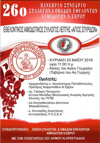 Η Ένωση Συλλόγων & Ομάδων Εθελοντών Αιμοδοτών Ν. Έβρου σε συνεργασία με τον Εθελοντικό Αιμοδοτικό Σύλλογο Λεπτής “Άγιος Σπυρίδων” και με την υποστήριξη του Δήμου Ορεστιάδας, σας προσκαλούν την Κυριακή 20 Μαΐου 2018 στις 11:00 π.μ. στο 26ο Πανέβριο Συνέδριο Συλλόγων και ομάδων Εθελοντών Αιμοδοτών Νομού Έβρου που θα διεξαχθεί στο Άλσος του Άγιου Γεωργίου στην Λεπτή Ορεστιάδας.