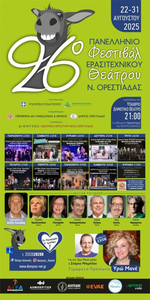 Το 26ο Πανελλήνιο Φεστιβάλ Ερασιτεχνικού Θεάτρου Νέας Ορεστιάδας διοργανώνεται από το Θεατρικό Εργαστήρι Νέας Ορεστιάδας ΔΙΟΝΥΣΟΣ, υπό την αιγίδα και την επιχορήγηση του Υπουργείου Πολιτισμού μέσω του Προγράμματος “Δημιουργική Ελλάδα”, σε συνδιοργάνωση με την Περιφέρεια Αν. Μακεδονίας και Θράκης και τον Δήμο Ορεστιάδας.