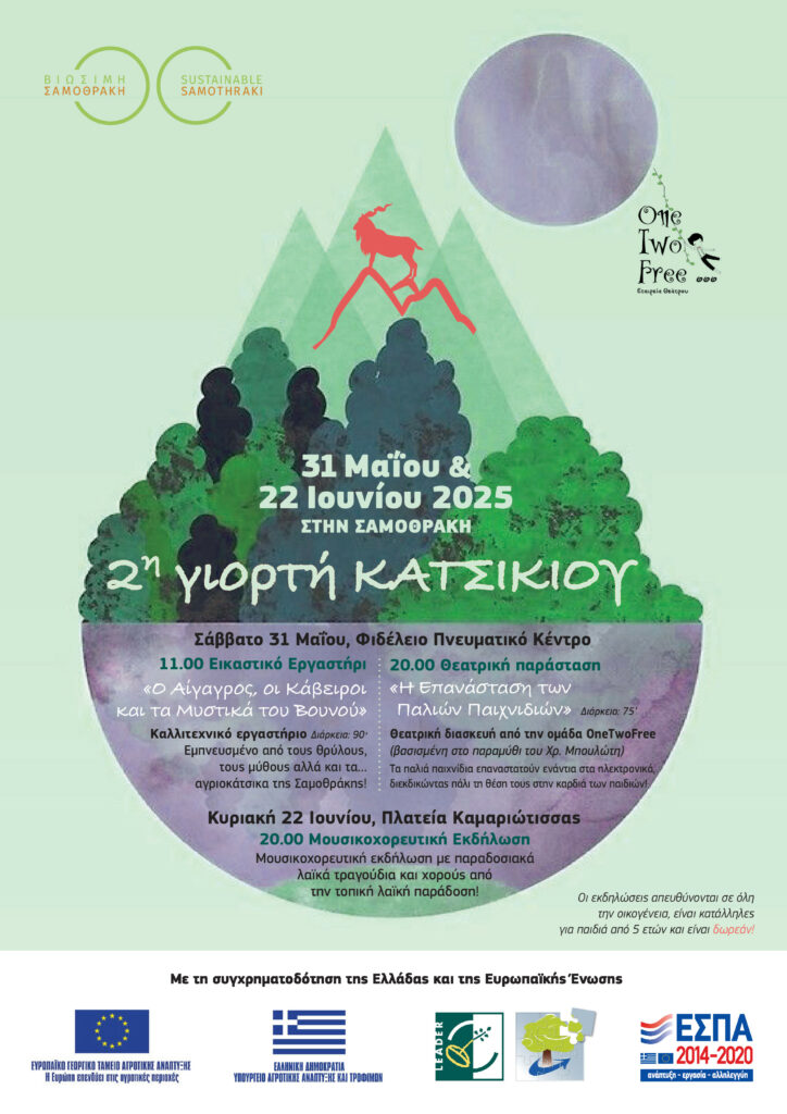 Ο Σύλλογος «Βιώσιμη Σαμοθράκη», στο πλαίσιο του Έργου «Γιορτή Κατσικιού», που χρηματοδοτείται από το Τοπικό Πρόγραμμα CLLD / LEADER 2014-2020, οργανώνει μια σειρά εκδηλώσεων που συνδυάζουν τα στοιχεία της τοπικής παράδοσης (μουσική, έθιμα, λαογραφία, μύθοι) με διαδραστικές θεατρικές και μουσικοχορευτικές δράσεις.