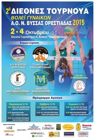 O Αθλητικός Όμιλος Νέας Βύσσας Ορεστιάδας διοργανώνει το 2ο διεθνές τουρνουά βόλεϊ γυναικών από 02 έως 04 Οκτωβρίου 2015 στο κλειστό γυμναστήριο Ν.Βύσσας «Σοφία Κανίδου», με τη συμμετοχή των Maritza Plovdiv, Cersi Spor Edirne, Νίκη Αλεξανδρούπολης.