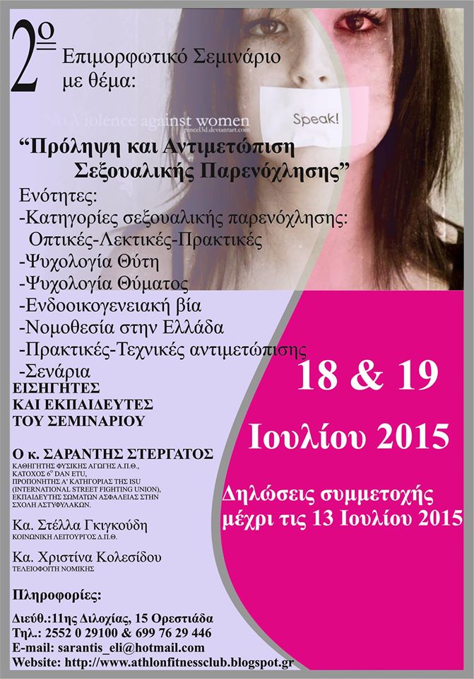 Το σεμινάριο έχει προληπτικό χαρακτήρα και απευθύνεται σε όποια γυναίκα θέλει να εφοδιαστεί με γνώσεις, ώστε να είναι αποτελεσματικότερα προστατευμένη απέναντι σε τέτοια φαινόμενα, τα οποία όπως έχουν δείξει έρευνες, έχουν αυξηθεί λόγω της οικονομικής δυσχέρειας και της κρίσης που διανύουμε.