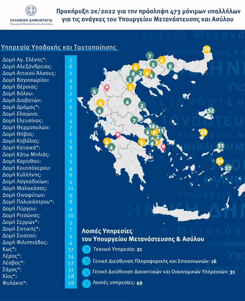 Ειδικότερα, προκηρύσσονται 237 θέσεις στις νέες δομές των νησιών και στο ΚΥΤ Φυλακίου Έβρου, 154 θέσεις για τις δομές στην ενδοχώρα, καθώς και 118 θέσεις για τις κεντρικές υπηρεσίες του Υπουργείου Μετανάστευσης και Ασύλου.