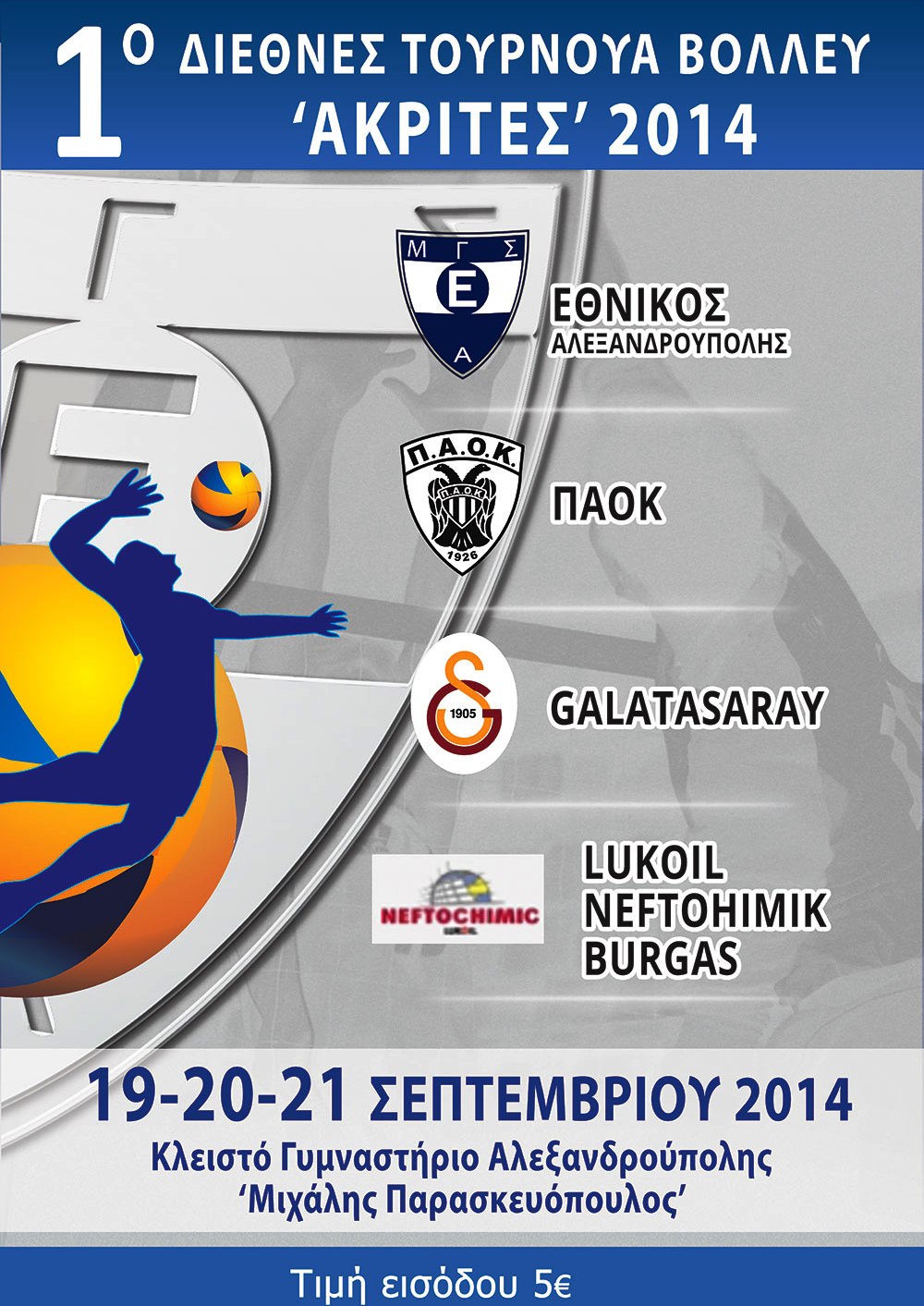 Το 1ο Διεθνές Τουρνουά Πετοσφαίρισης που θα διοργανώσει για πρώτη φορά ο Εθνικός Αλεξανδρούπολης είναι γεγονός! Πριν ξεκινήσει η κανονική αγωνιστική περίοδος οι φίλαθλοι της Αλεξανδρούπολης θα έχουν τη δυνατότητα να παρακολουθήσουν την αγαπημένη τους ομάδα…Γαλατασαράι, Λουκόιλ, ΠΑΟΚ με οικοδεσπότη τον Εθνικό Αλεξανδρούπολης θα αγωνιστούν σε ένα 3μερο τουρνουά γεμάτο συγκινήσεις. Στις 19, 20 & 21 Σεπτεμβρίου δίνουμε όλοι ραντεβού στο Κλειστό Γυμναστήριο «Μιχάλης Παρασκευόπουλος» για να χειροκροτήσουμε αλλά και να καλωσορίσουμε από κοντά τους νέους παίκτες της ομάδας μας !Είμαστε σίγουροι πως οι ομάδες που θα συναγωνιστούν στο τουρνουά θα ανεβάσουν τον πήχη και την αδρεναλίνη πάνω από το φιλέ!