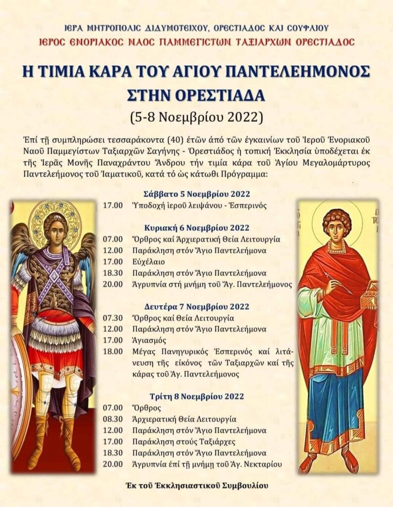 Σαράντα χρόνια συμπληρώνονται φέτος από τα εγκαίνια του Ιερού Ενοριακού Ναού Παμμεγίστων Ταξιαρχών Σαγήνης – Ορεστιάδος. Με αφορμή την επέτειο αυτή, η τοπική εκκλησία υποδέχεται, από την Ιερά Μονή Παναχράντου Άνδρου, την τιμία κάρα του Αγίου Μεγαλομάρτυρος Παντελεήμονος του Ιαματικού, με θρησκευτικές εκδηλώσεις σύμφωνα με το παρακάτω πρόγραμμα: