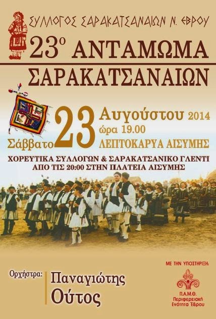 Το 23ο Αντάμωμα Σαρακατσαναίων διοργανώνει το Σάββατο 23 Αυγούστου στον παραδοσιακό οικισμό Λεπτοκαρυάς Αισύμης ο Σύλλογος Σαρακατσαναίων νομού Έβρου. Το πρόγραμμα της εκδήλωσης, που θα ξεκινήσει στις 7 το απόγευμα, περιλαμβάνει αναπαραστάσεις εθίμων, εμφάνιση χορευτικών συγκροτημάτων και σαρακατσάνικο γλέντι με ζωντανή μουσική.