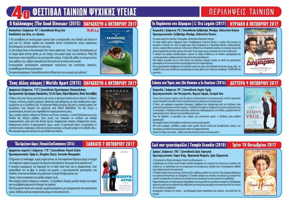 Οι ταινίες θα προβάλλονται κάθε βράδυ στο θέατρο “Διόνυσος” από τις 6 έως τις 10 Οκτωβρίου στις 9:15 μ.μ. Την Παρασκευή 6 Οκτωβρίου θα προβληθεί η παιδική ταινία στις 10:00 π.μ.