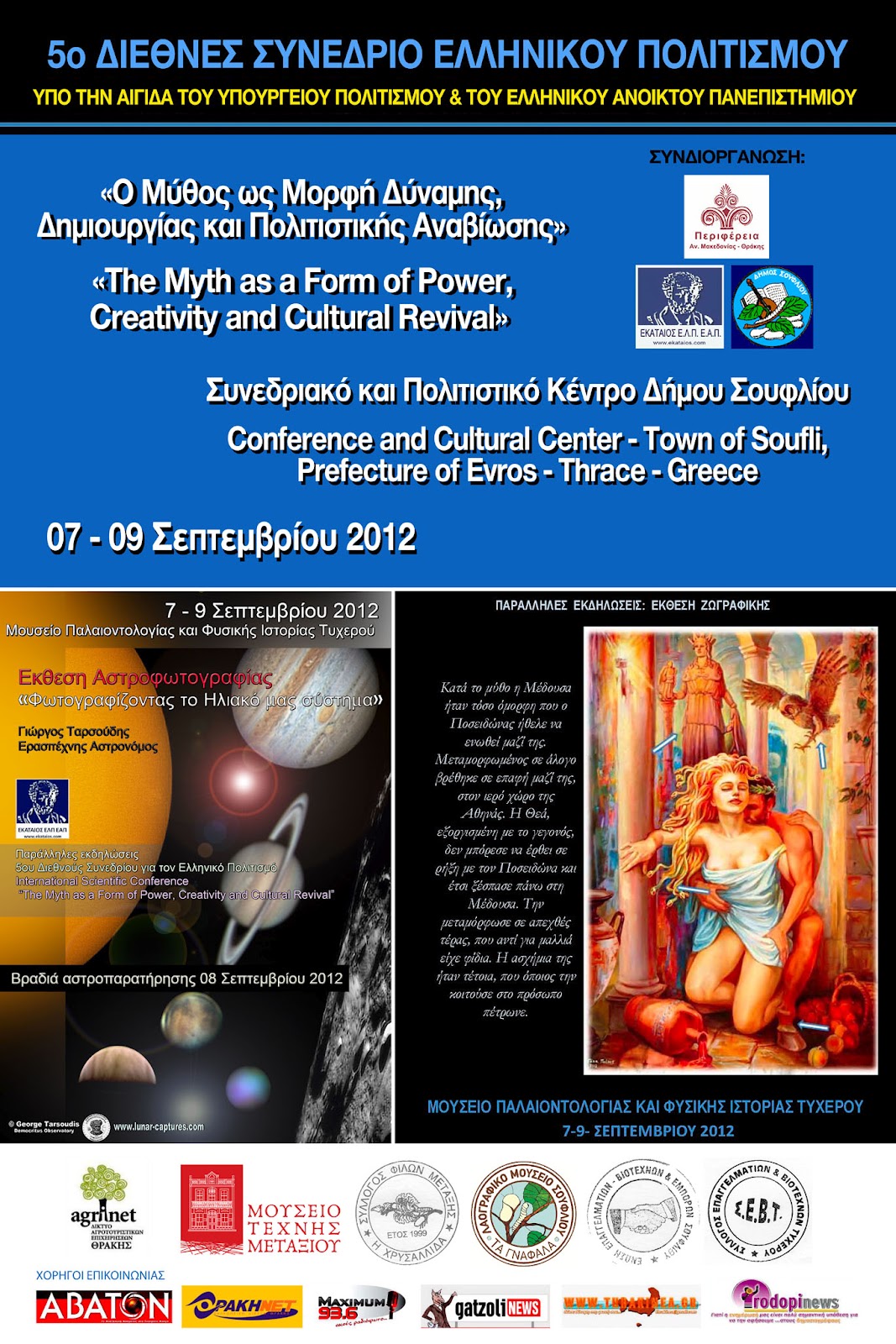 Η Ένωση Πολιτισμολόγων Ελλάδας «Εκαταίος», σε συνεργασία με την Περιφερειακή Ενότητα Έβρου και το Δήμο Σουφλίου, διοργανώνει από 7 έως 9 Σεπτεμβρίου 2012 στο Σουφλί το 5ο Διεθνές Συνέδριο Ελληνικού Πολιτισμού με θέμα «Ο Μύθος ως Μορφή Δύναμης, Δημιουργίας και Πολιτιστικής Αναβίωσης».