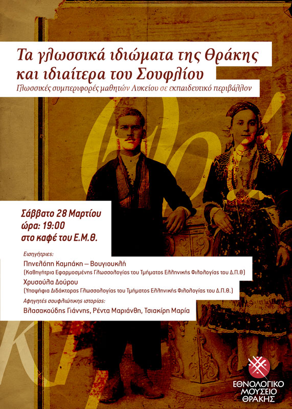 Εκδήλωση – ομιλία με θέμα: “Τα γλωσσικά ιδιώματα της Θράκης και ιδιαίτερα του Σουφλίου”