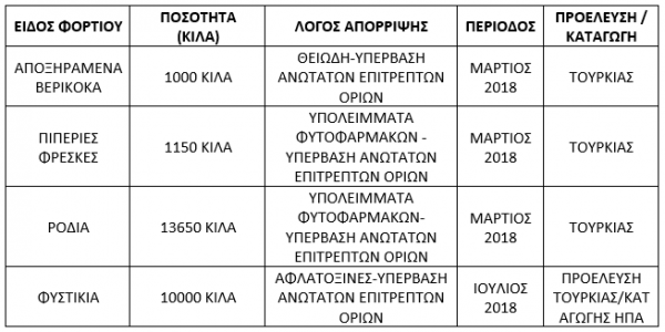 Από την Περιφερειακή Ενότητα Έβρου ανακοινώνεται ότι κατά το χρονικό διάστημα από τον Μάρτιο έως τον Σεπτέμβριο 2018 οι γεωπόνοι ελεγκτές της Διεύθυνσης Αγροτικής Οικονομίας και Κτηνιατρικής Έβρου στο τελωνείο Κήπων προέβησαν στη δέσμευση και απόρριψη φορτίων με προϊόντα προέλευσης Τουρκίας, συνολικής ποσότητας 54,5 τόνων περίπου, μετά από τακτικούς και έκτακτους ελέγχους που πραγματοποίησαν.