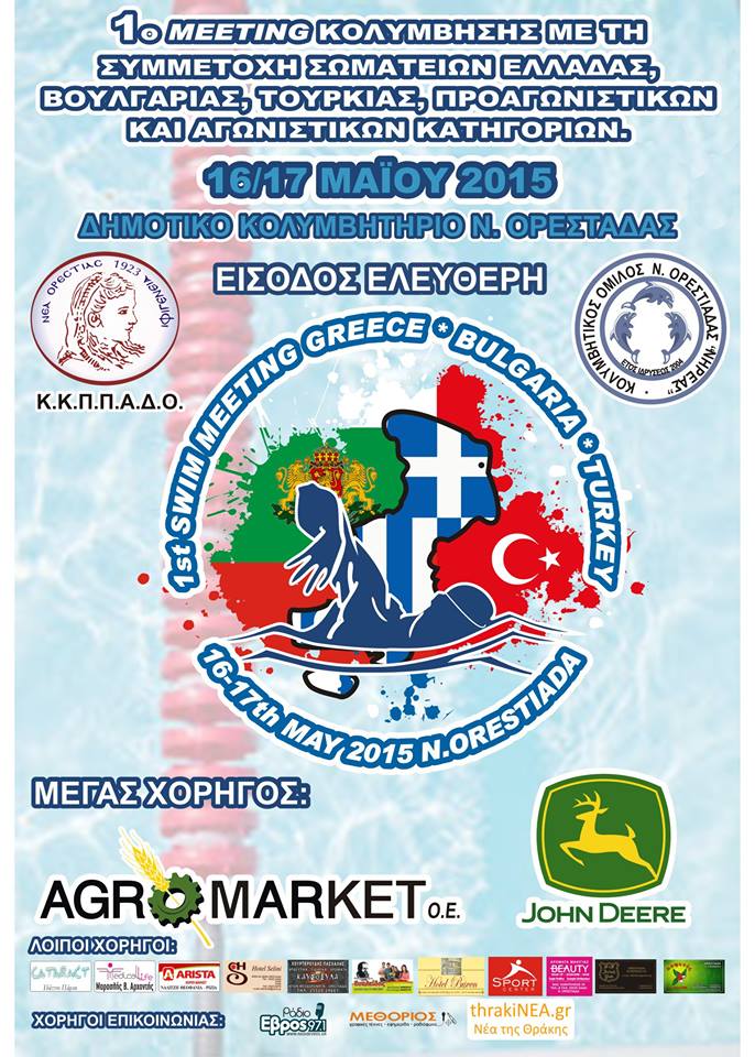 Ο Κολυμβητικός Όμιλος Ν. Ορεστιάδας “Νηρέας” σε συνεργασία με το Κ.Κ.Π.Α.Α.Δ.Ο., διοργανώνει το 1ο Meeting κολύμβησης με τη συμμετοχή Σωματείων Ελλάδας, Βουλγαρίας και Τουρκίας. Η τελετή έναρξης του Meeting θα πραγματοποιηθεί το Σάββατο 16 Μαΐου 2015 και ώρα 17:00 στο δημοτικό κολυμβητήριο Ορεστιάδας.