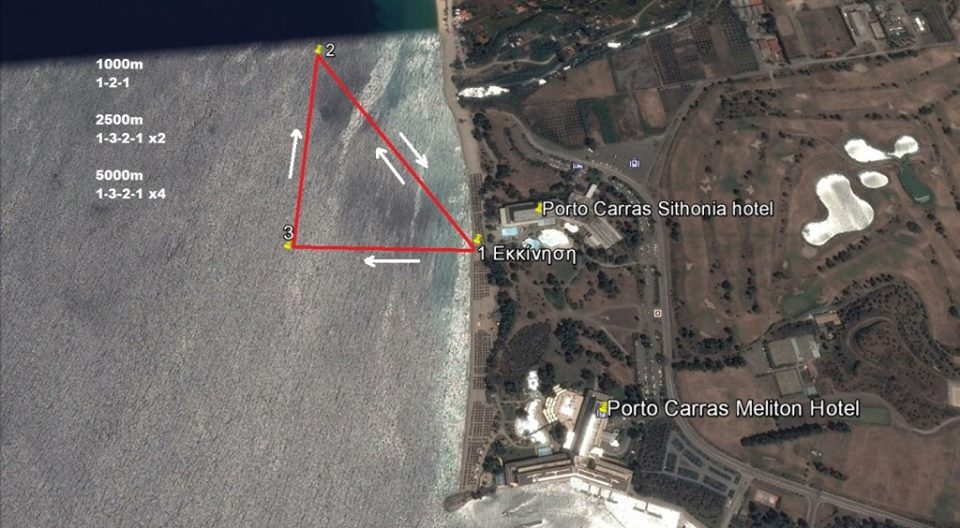 Οι αθλητές των 1000 μέτρων θα κινηθούν προς την σημαδούρα Νο2 και θα επιστρέψουν στην ακτή για τον τερματισμό.
